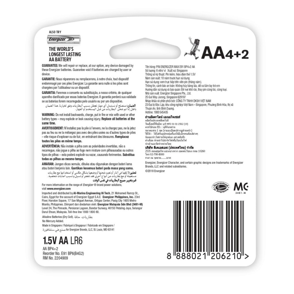 Tên sản phẩm: PIN ENERGIZER MAX E91 BP4+2 AASố lượng: 6 viên.