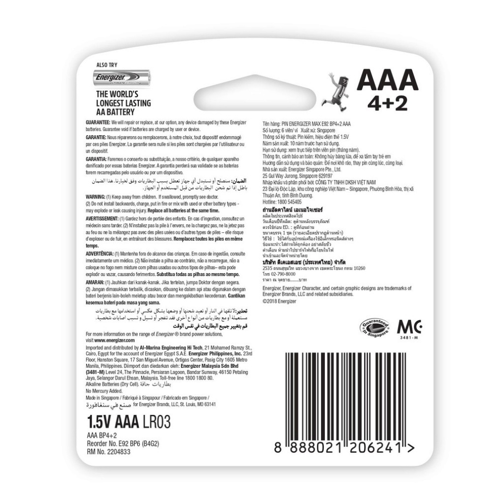 Nhà SX: Energizer Singapore Pte., Ltd 25 Gul WayJurong, Singapore 629197.