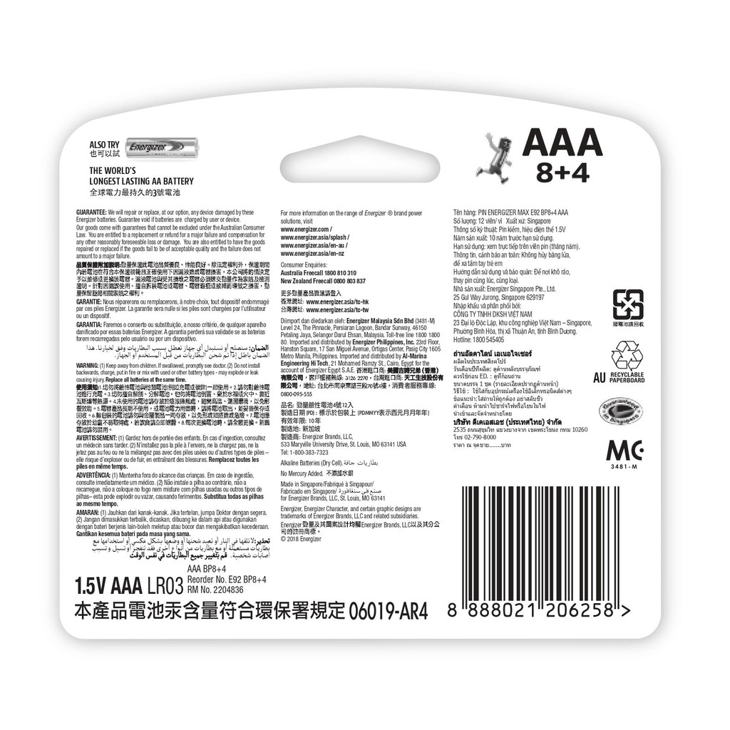 Tên sản phẩm: PIN ENERGIZER MAX E92 BP8+4 AAASố lượng: 12 viên.