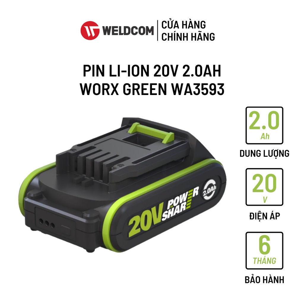 Pin Li-ion 20V 2.0Ah WORX GREEN WA3593 Có Đèn Báo Dung Lượng Pin Chính HãngTHÔNG TIN SẢN PHẨM (Pin Li-ion 20V 2.0Ah WORX GREEN WA3593)