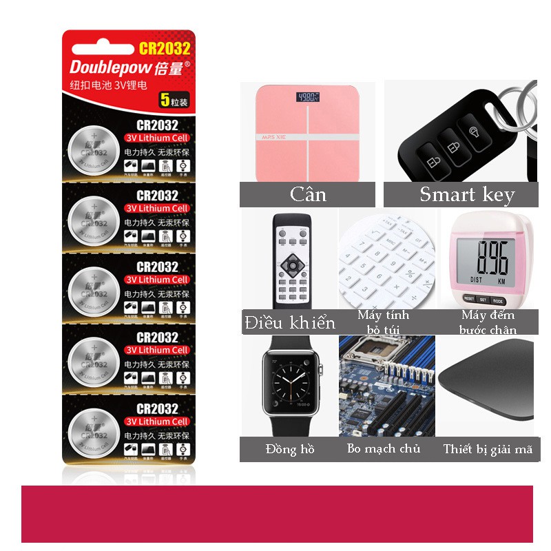 Pin Lithium CR2032 3V Doublepow cao cấp- Vỉ 5 viên - Dùng cho Smart key ô tô, xe máy, cân điện tử, bo mạch chủ,..Pin CR2032 được tích hợp trong thiết bị máy đo đường huyết, máy tính, đồ chơi, điều khiển, remote bluetooth, smartkey xe máy, bo mạch chủ máy tính, thiết bị điện tử…
