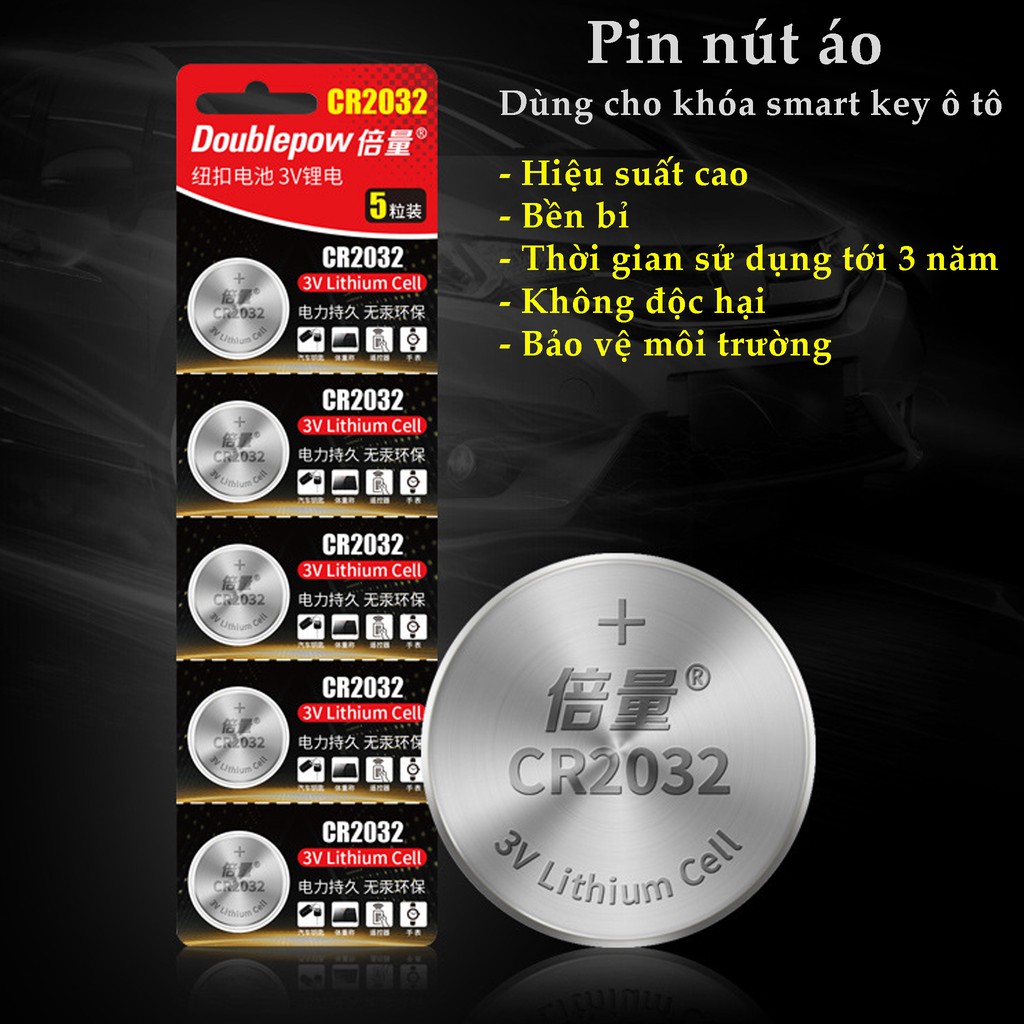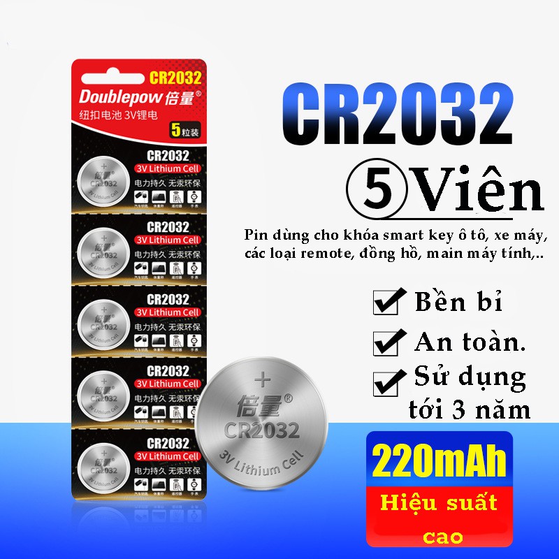 Pin Lithium CR2032 3V Doublepow cao cấp- Vỉ 5 viên - Dùng cho Smart key ô tô, xe máy, cân điện tử, bo mạch chủ,..