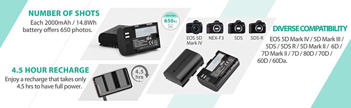 Pin thay thế RAVPower được thực hiện theo các thông số kỹ thuật chính xác của pin Canon LP-E6 với dung lượng lớn hơn 2000mAh. Cũng giống như pin gốc của bạn, pin RAVPower cũng có thể được sạc bên trong máy ảnh của bạn hoặc với bộ sạc gốc. Bộ sạc và pin hoàn toàn có thể hoán đổi cho nhau.
