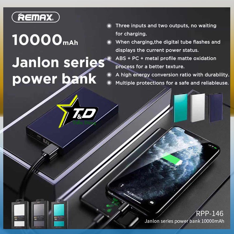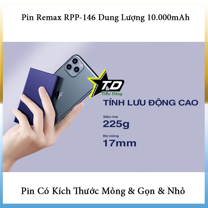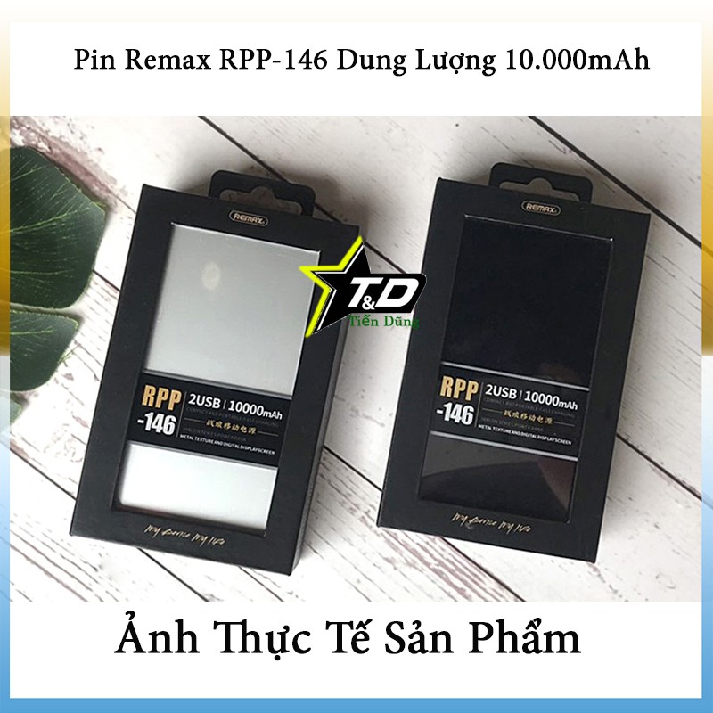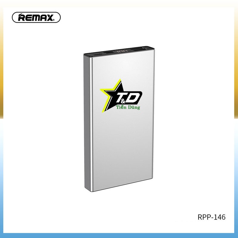 - Pin sạc dự phòng 10.000mAh Remax RPP-146 là một sản phẩm có vẻ đẹp lộng lẫy, gọn nhẹ, nhưng sở hữu dung lượng pin tới 10.000mAh cùng 5 cổng sạc nhanh vào/ra. Sản phẩm phù hợp cho những chuyến đi du lịch hoặc dạo phố.
