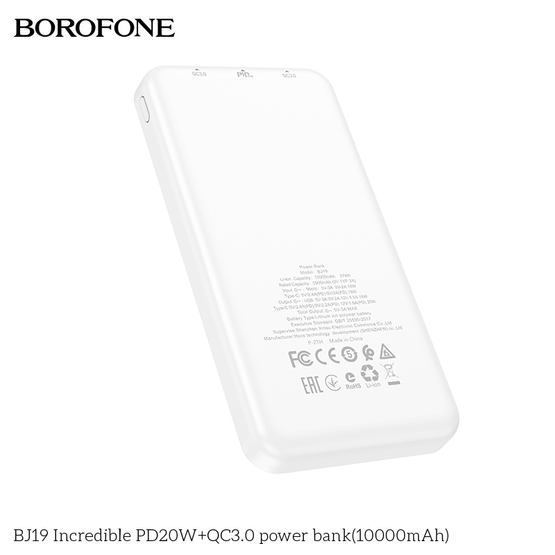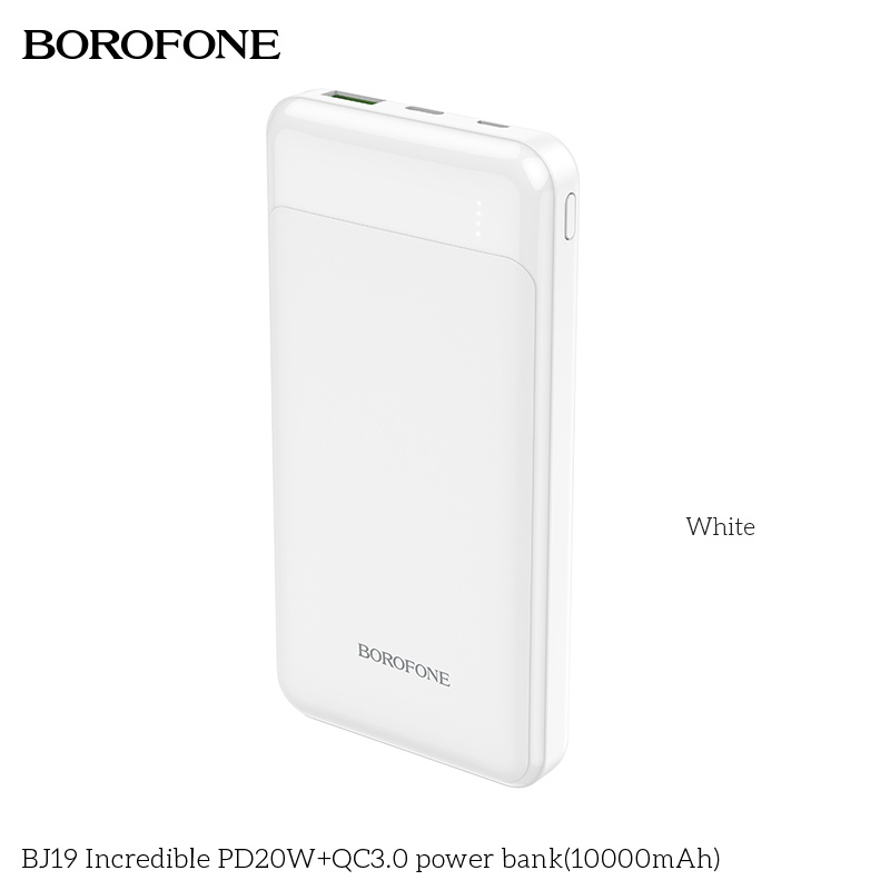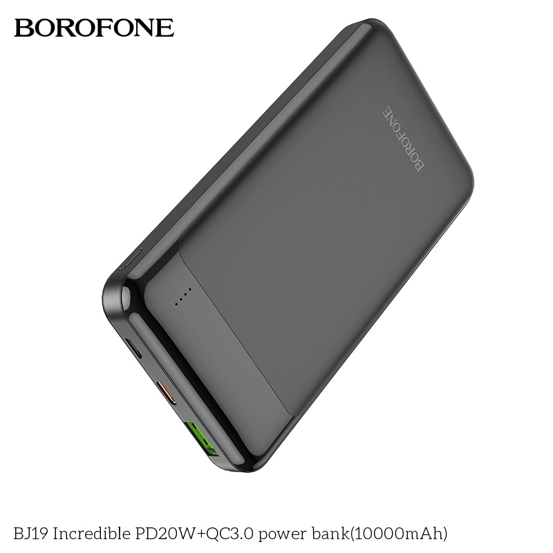 Pin Sạc Dự Phòng BOROFONE BJ19, 10000mah, Micro USB / USB C, 1 cổng Type-C hỗ trợ sạc nhanh PD20W và 1 cổng sạc USB 18W, Đèn Led hiển thị dung lượng pin là một sản phẩm của BOROFONE đến từ Hongkong, đây là thương hiệu chuyên sản xuất các phụ kiện dành cho điện thoại với các mức giá ở tầm trung nên được rất nhiều lựa chọn và tin dùng.