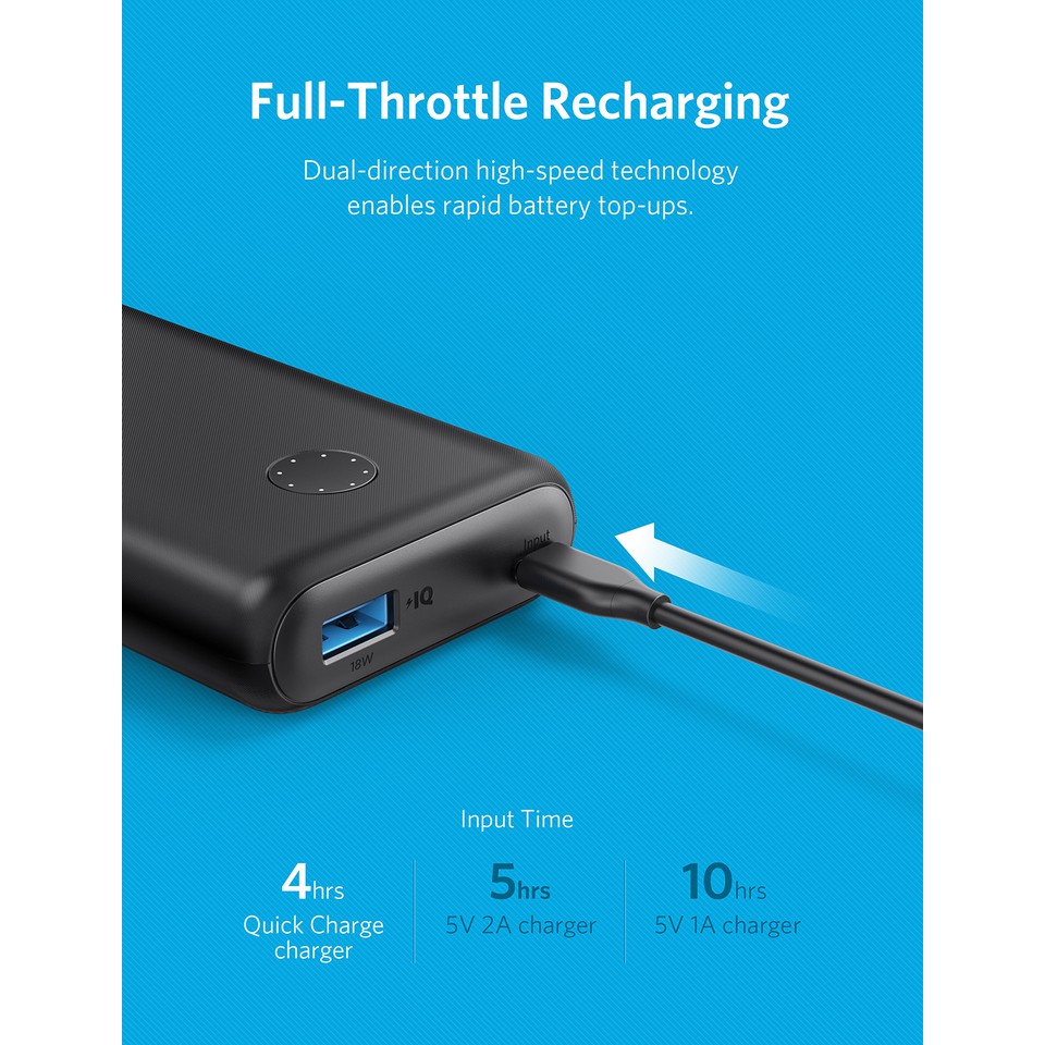 ⚡ Power IQ 2.0 hiện nay đa hướng, cho phép PowerCore II tận dụng tính năng nạp nhanh. Chỉ cần 4 giờ để sạc đầy với bộ sạc (củ sạc, adapter) Quick Charge 3.0 18w, giúp bạn tiết kiệm thời gian sạc vào cho pin và dành nhiều thời gian hơn nữa cho cuộc sống.