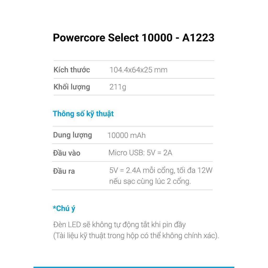 🔥 Anker PowerCore Select 10000mAh✔ Được làm bằng polycarbonate cao su bền và có khả năng chống sốc. Thiết bị chỉ có hai đầu nối đầu ra USB với tổng cường độ 4,8 A và công suất tối đa 12 watt. Pin được sạc từ nguồn điện sử dụng cổng microUSB với công suất đầu vào là 10 watt.
