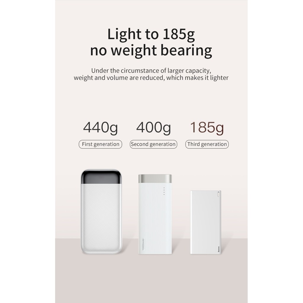 - Thiết kế đẹp, nhỏ gọn , thời trang và siêu mỏng là ưu điểm nổi bật của pin sạc dự phòng Baseus Mini Digital Display 10,000mAh. Sản phẩm có kích thước nhỏ gọn, siêu mỏng . Hai cạnh viền được vát mỏng 3D cho cảm giác mỏng và gọn hơn, cầm trên tay thoải mái hơn. Bạn có thể dễ dàng mang theo mọi lúc mọi nơi, thậm chí có thể bỏ vào túi quần mà không gây ra cảm giác vướng víu , khó chịu .