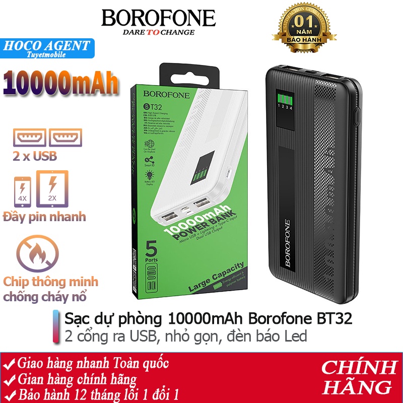 Pin sạc dự phòng Borofone BT32 đèn báo LED, 2 cổng ra, tích điện dung lượng 10000mAh - Chính hãng