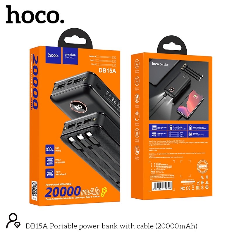 Điện Thoại & Phụ Kiện > Phụ kiện > Sạc dự phòng & Pin > Sạc dự phòng || Pin sạc dự phòng Hoco DB15A 20000mAh 2 input, 2 output, kèm 3 cáp sạc, chức năng đèn pin (Đen) - Nhất Tín ComputerCòn hàng