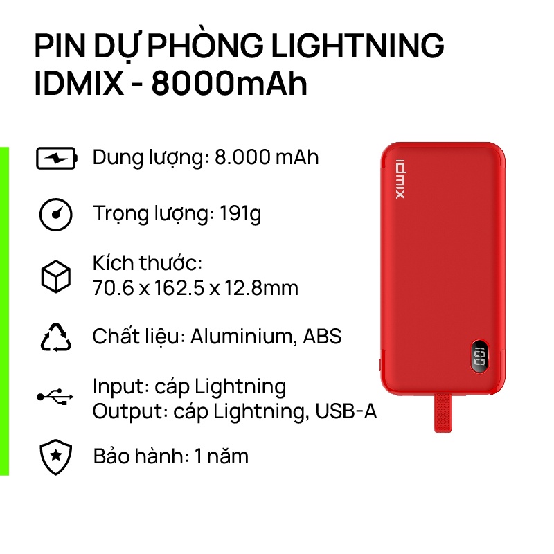 - Tên sản phẩm: Pin dự phòng Lightning IDMIX