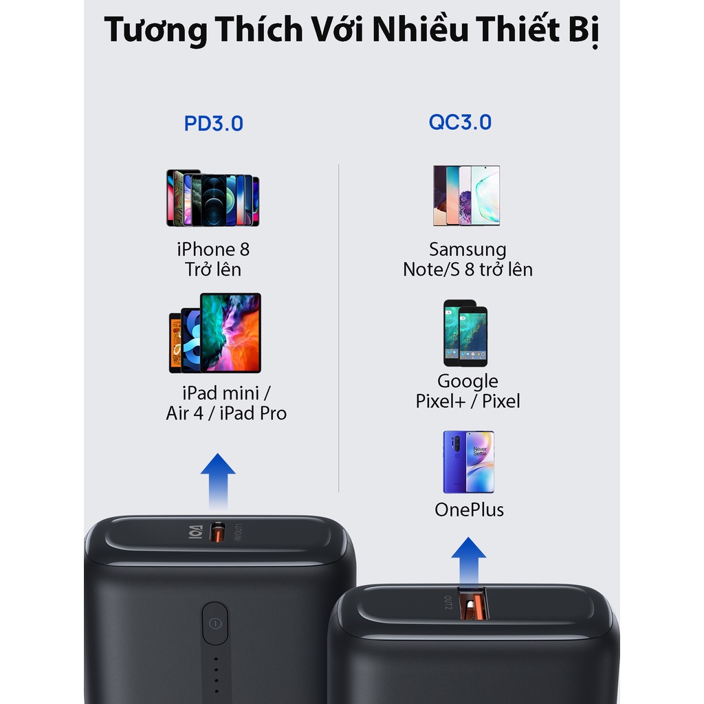 Công nghệ sạc nhanh bằng cổng USB-C Power Delivery 3.0 20W và Cổng USB-A Quick Charge 3.0 18W Sạc được nhiều thiết bị chỉ bằng một pin sạc dự phòng duy nhất.