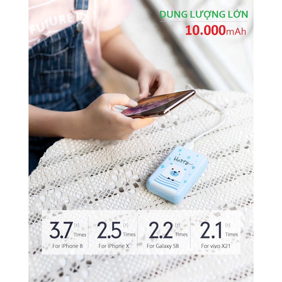 +, Dung lượng pin 10000mAh có thể sạc đầy 3-4 lần các smartphone hiện nay, thoải mái sử dụng trong 1-3 ngày tùy tần suất sạc pin của bạn.