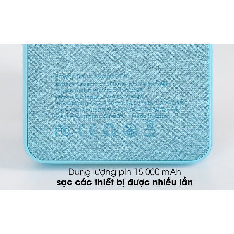 Dung lượng 15.000 mAh sạc nhiều lần cho các thiết bị.