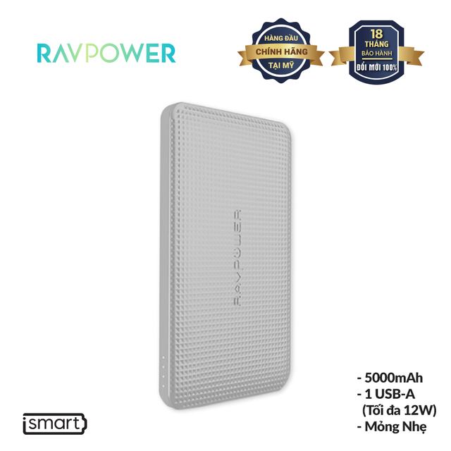 [Mã BMBAU50 giảm 7% đơn 99K] Pin Sạc Dự Phòng RAVPower 5000mAh Công nghệ iSmart, Thiết Kế Mỏng Nhẹ RP-PB093