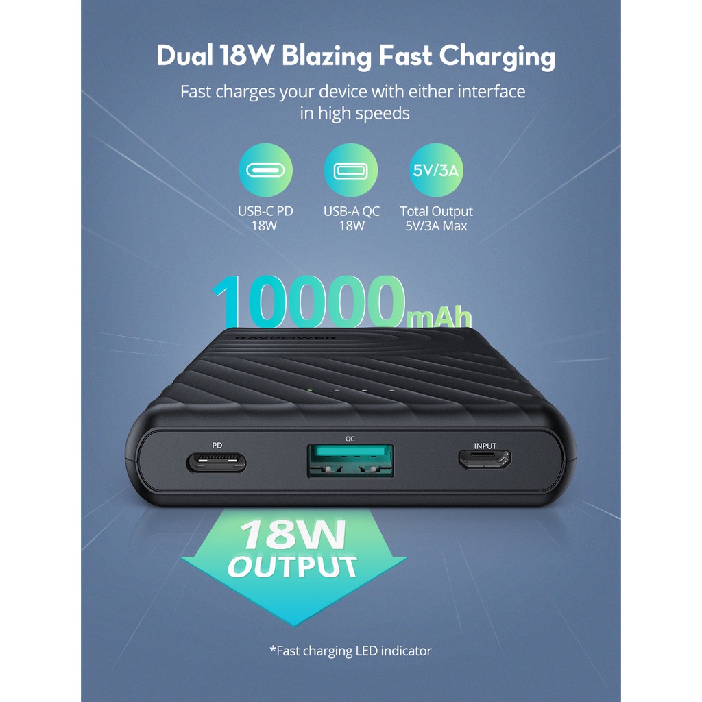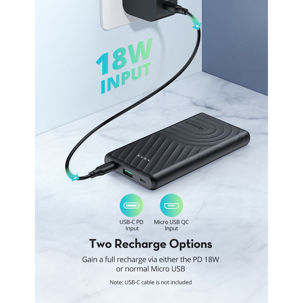 Pin Sạc Dự Phòng RAVPower 10000mAh In/Out Type-C QC 3.0 + PD 18W Thiết Kế Mỏng Nhẹ - RP-PB195==========================
