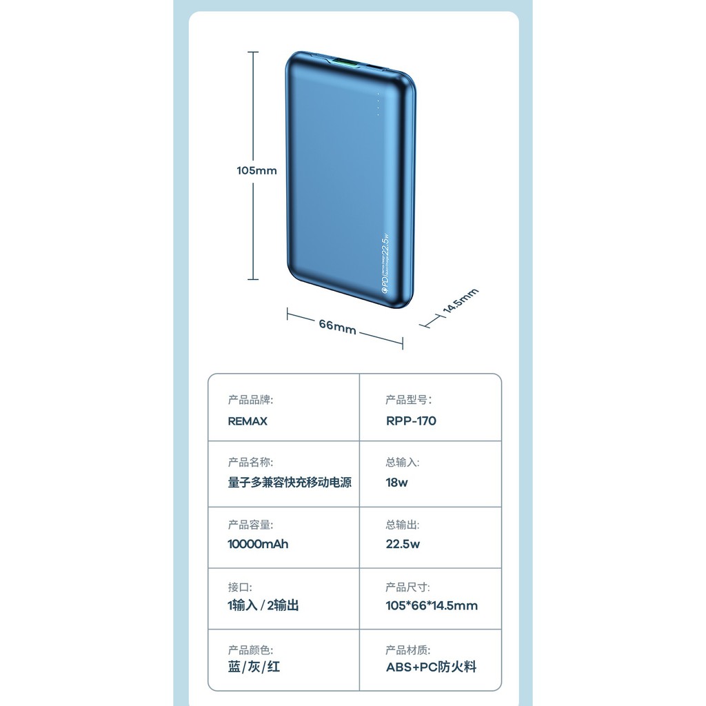 Pin sạc dự phòng Remax RPP-170 10000mAh 22.5W, USB QC3.0 và PD18W Type-C - Nhất Tín ComputerThiết kế nhỏ gọn, mỏng nhẹ, vừa lòng bàn tay