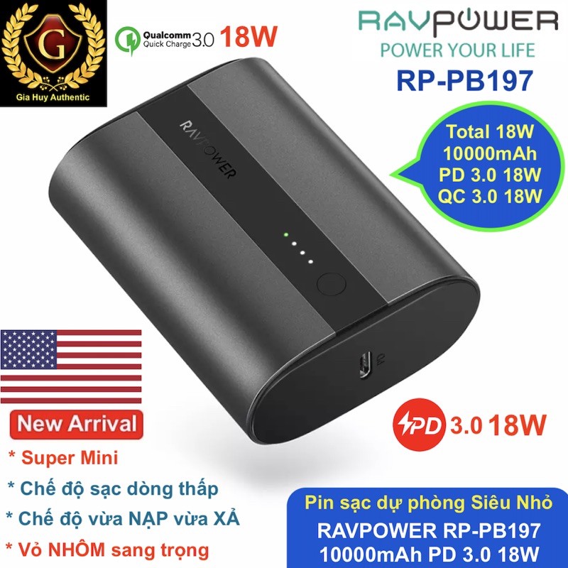 Điện Thoại & Phụ Kiện > Pin sạc dự phòng > 5000 - 10000mAh || Pin sạc dự phòng Super Mini, thân NHÔM RavPOWER RP-PB197 10000mAh PD 3.0 18W & QC 3.0 18WCòn hàng