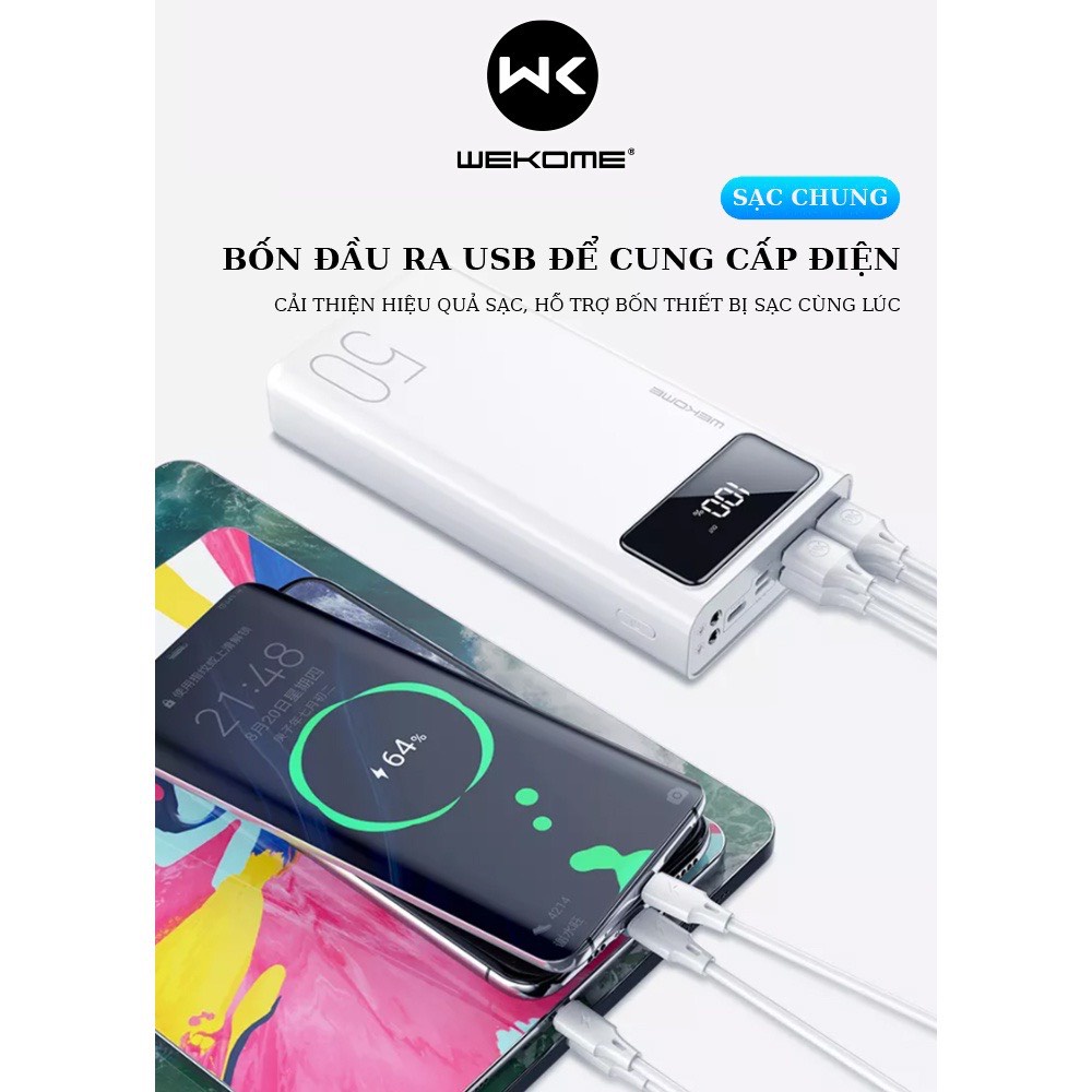 - Sạc dự phòng Wekome WP-171 với dung lượng 50000mAh với ít nhất 20 lần sạc đầy cho chiếc điện thoại sẽ đem đến sự yên tâm đồng hành cùng bạn trong suốt thời gian bạn rời khỏi nhà mà không cần lo kiếm ổ cắm điện để sạc điện thoại.