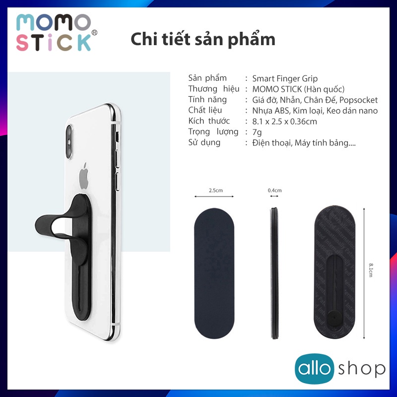 MOMOSTICK là một phụ kiện độc đáo đến từ Hàn Quốc không thể thiếu cho người dùng điện thoại ngày nay, hỗ trợ bạn sử dụng máy một cách an toàn hơn chống rơi rớt và giật điện thoại, mà còn thêm nhiều tính năng hữu ích khác như: Làm giá đỡ để bàn, nhẫn đeo chụp anh tự sướng dễ dàng và rất nhiều tính năng thú vị khác.---------------------------------------------
