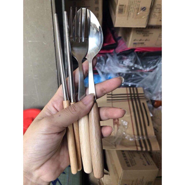 Bộ Thìa Đũa Dĩa inox cán gỗ kèm hộp☘️ Bộ thìa - dĩa - đũa inox kết hợp cán gỗ , hộp đựng bằng nhựa lúa mạch sang - xịn