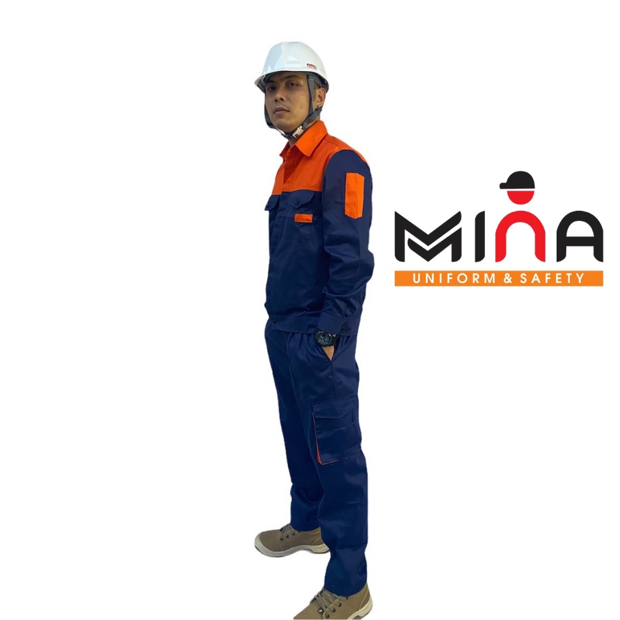 Giới thiệu Quần áo bảo hộ lao động -Bộ tím than phối cam - Vải kaki v31- áo bảo hộ cúc - quần túi hộp