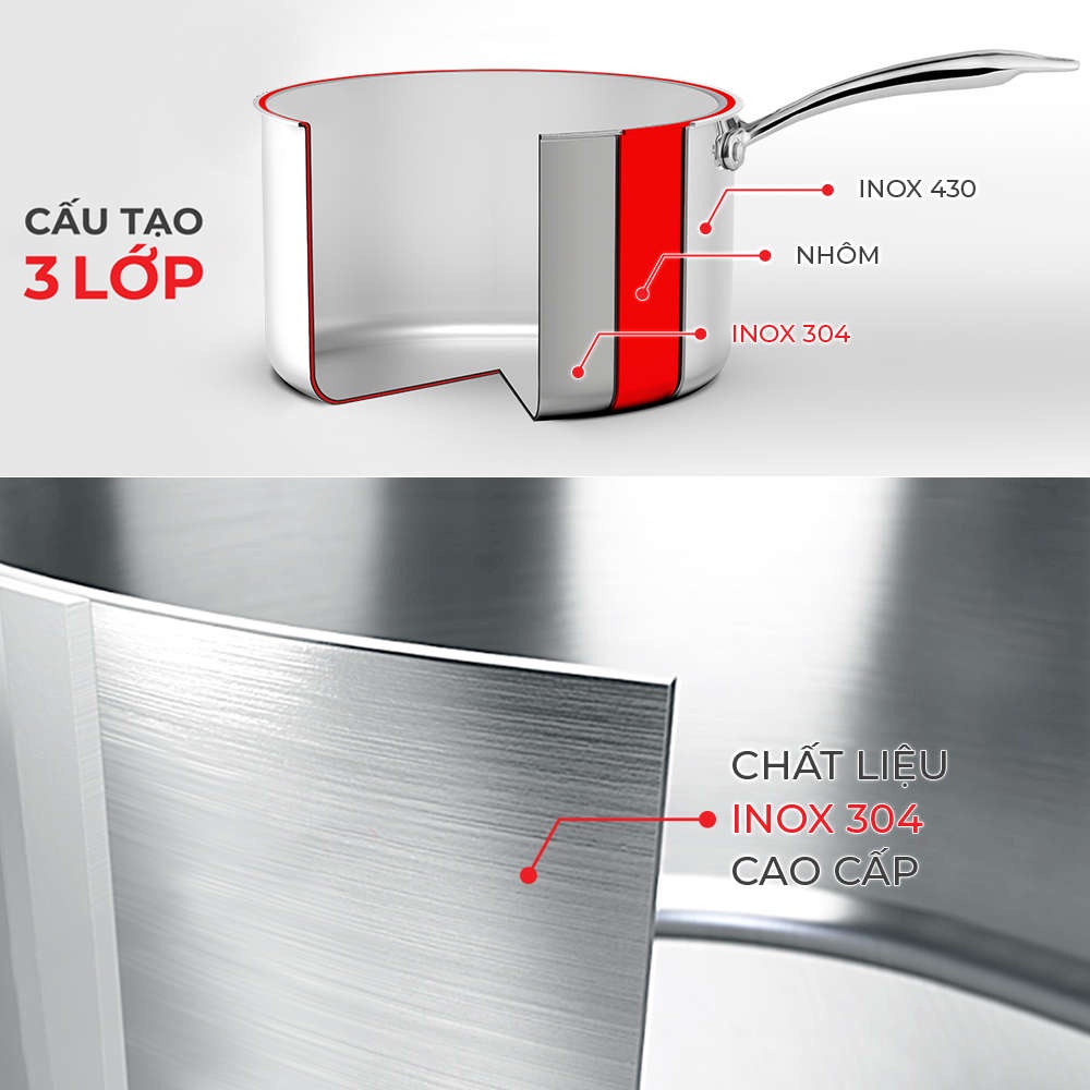 “Bí mật” của Trimax Baby nằm ở cấu tạo 3 lớp liền thân dày dặn - Sự kết hợp hoàn hảo của 3 lớp kim loại để tối ưu hiệu quả của từng loại chất liệu: