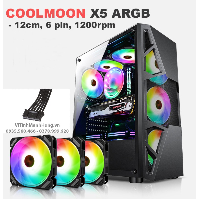 Máy tính & Laptop > Linh Kiện Máy Tính > Quạt và Tản Nhiệt || Quạt CoolMoon X5 - Fan CoolMoon X5, Led RGB 12cm, 6 pin, 1200rpm, đồng bộ hub CoolMoon.Còn hàng