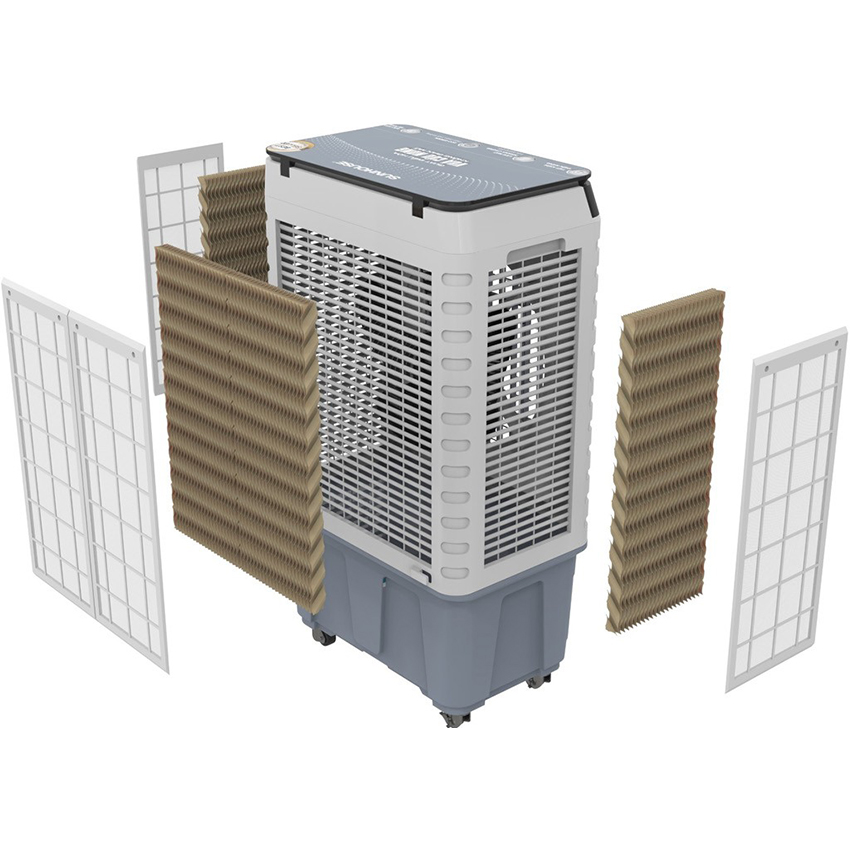 Quạt điều hòa có công suất lớn 190W làm mát hiệu quả trong phạm vi từ 45 - 55 m² Dung tích bình chứa nước 60 lít, thời gian sử dụng lâu, hạn chế châm nước nhiều lần Động cơ AC làm bằng đồng nguyên chất siêu bền, hoạt động ổn định 2 chế độ gió và 3 mức gió cho bạn tùy chọn theo nhu cầu sử dụng Bên dưới thân quạt có bánh xe nhỏ giúp việc di chuyển dễ dàng hơn Tự động ngắt bơm khi cạn nước hoặc khi quá nhiệt bơm