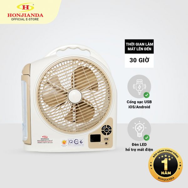 Quạt sạc tích điện dạng hộp AC&DC 10 inch Honjianda FL223/FL213 1-2 bình - có đèn LED & USB