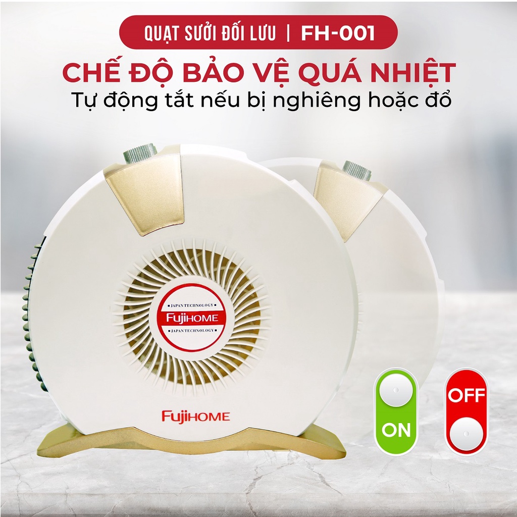 FUJIHOME FH-001 hoạt động theo cơ chế của dòng khí đối lưu, với 2 mức công suất 800 và 1600W. Theo đó, dòng khí lạnh sẽ di chuyển qua khe hút gió phía dưới, sau đó di chuyển lên trên và được làm nóng bởi mai xo siêu nhỏ. Dòng khí sau khi được làm nóng sẽ di chuyển tiếp lên trên và lan tỏa đều khắp không gian phòng, tạo cảm giác ấm áp.