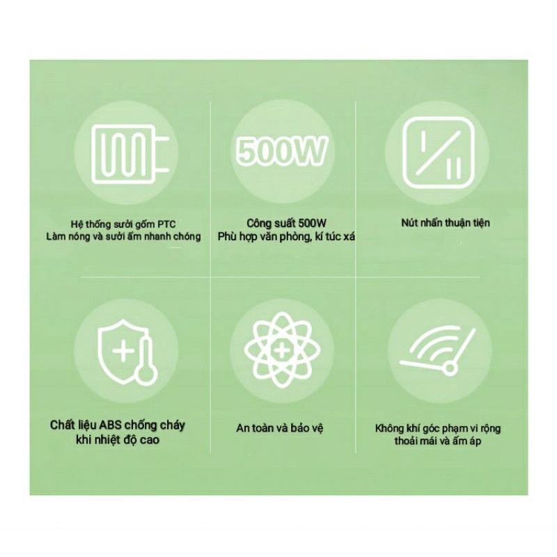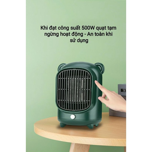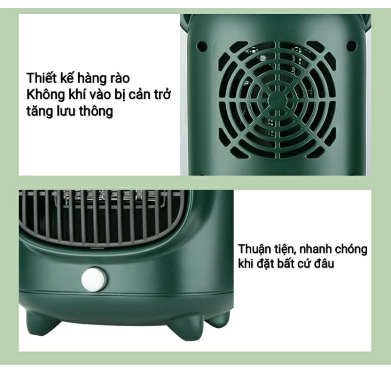 ☘️Hệ thống Sưởi Gốm cực kỳ hiện đại - Không khô da - Thiết kế xinh xắn, nhỏ gọn, dễ di chuyển mọi nơi phù hợp dùng cho dân văn phòng, học sinh, sinh viên,...- Chất liệu nhựa ABS + PA dày dặn, bền đẹp☘️💥Quạt sưởi mini để bàn 500W - Quạt sưởi mini công suất lớn - Hệ thống sưởi nhanh trong 3s mang đến sự ấm áp nhanh chóng. Thiết kế đẹp mắt. Phù hợp để mọi vị trí: sàn nhà, bàn, ghế,....
