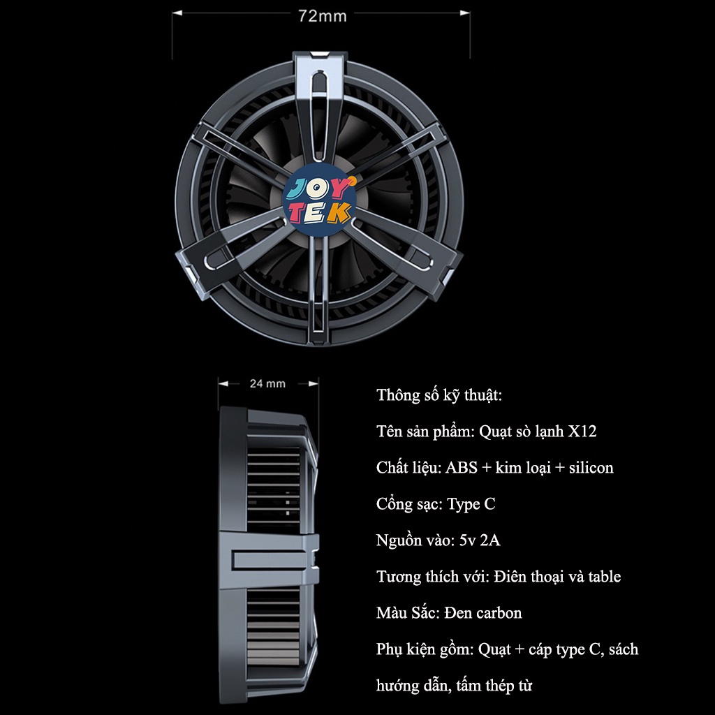 QUẠT TẢN NHIỆT ĐIỆN THOẠI SÒ LẠNH X12 phiên bản mới ra mắt tháng 9/2021Công dụng: Quạt tản nhiệt điện thoại nhỏ gọn, tiện lợi, giúp tản nhiệt cho điện thoại không bị nóng, đơ, lag, hạn chế chai pin, loạn cảm ứng…. Bạn sẽ thoải mái “chiến đấu” với những trận game hấp dẫn hàng giờ liền mà không cảm thấy phiền toái vì điện thoại nóng khi sử dụng phụ kiện chơi game này.