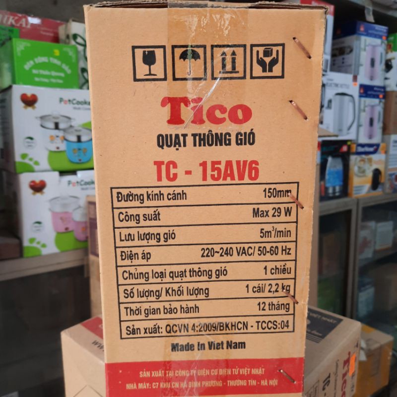 Sản phẩm quạt thông gió , hút mùi Tico TC - 15AV6 là sản phẩm made in Việt Nam , được sản xuất tại công ty Điện Cơ Điện Tử Việt Nhật , sản phẩm làm bằng 100% mô tơ đồng , rất bền bỉ theo thời gianTHÔNG SỐ KỸ THUẬT :