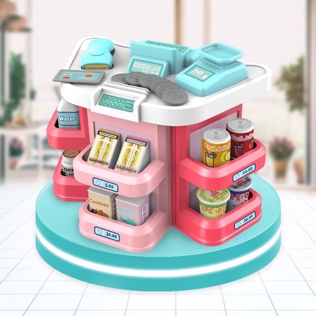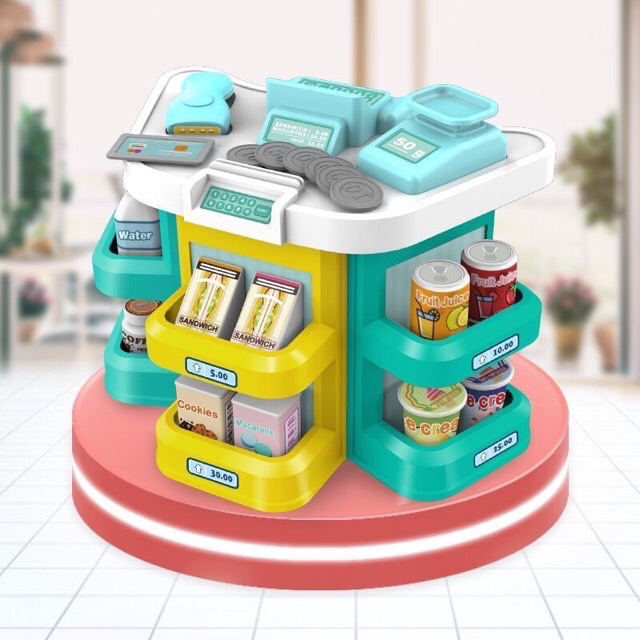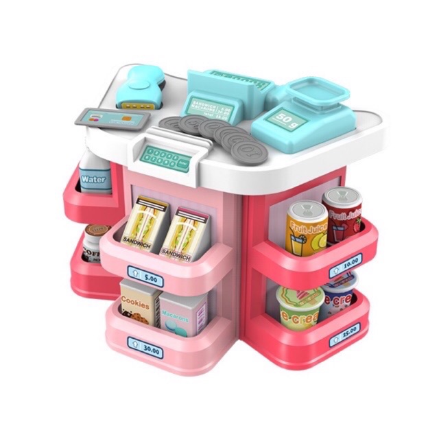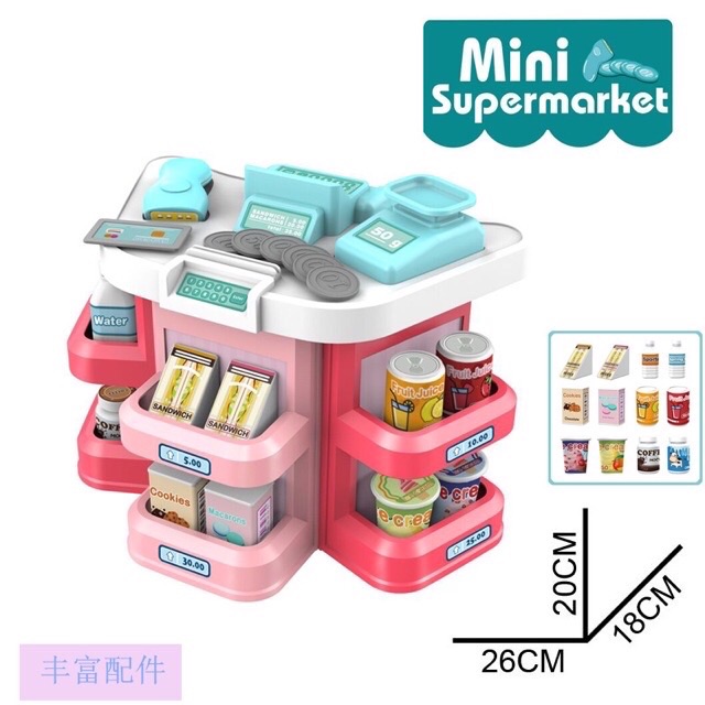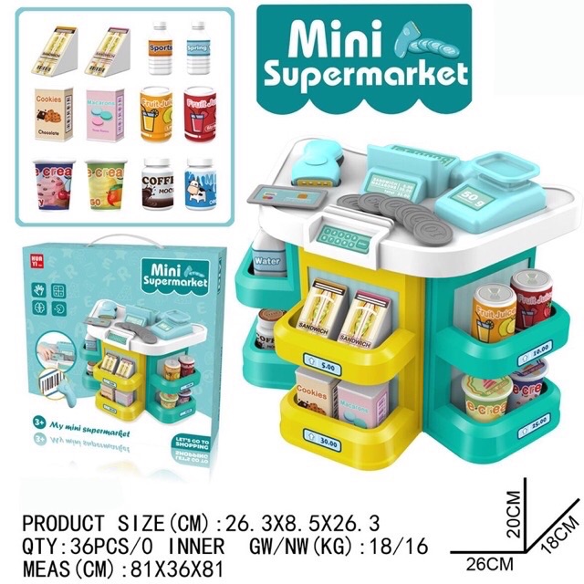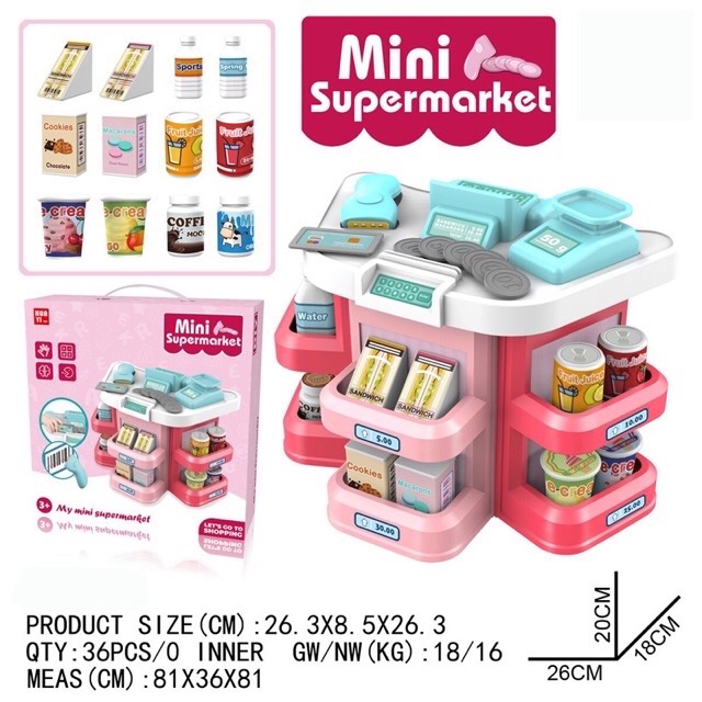 Mô phỏng một quầy siêu thị bán hàng nho nhỏKích thước 26x20x18cm cùng những phụ kiện kèm theo như lon nước, hộp bánh, tiền xu, máy tính tiền.