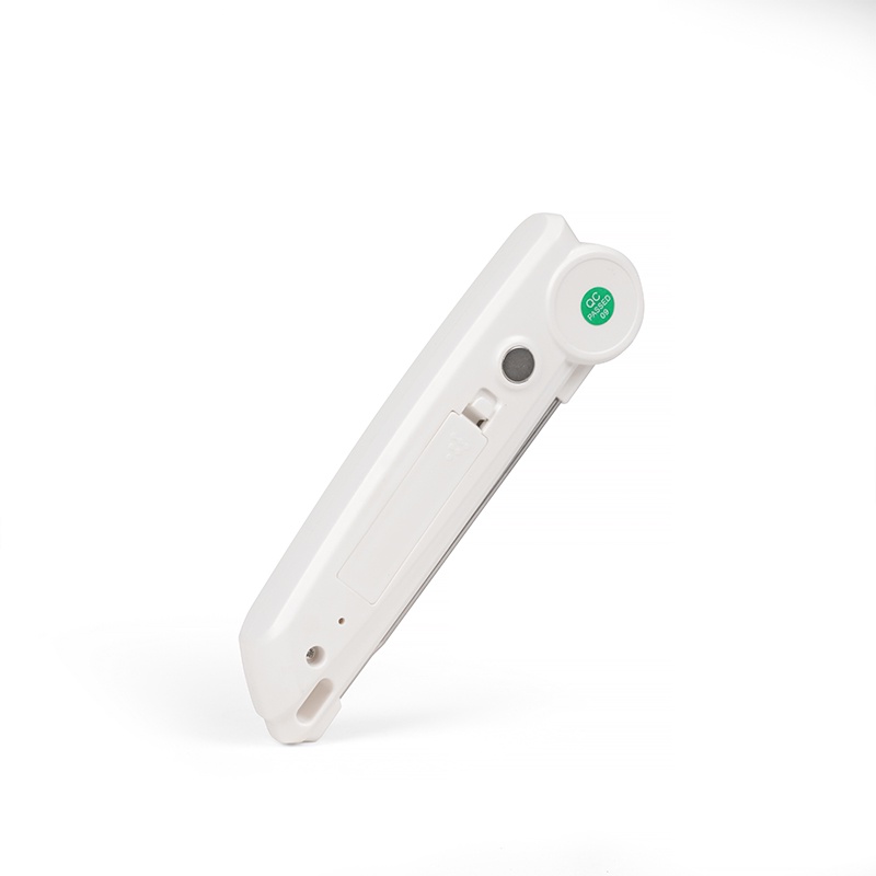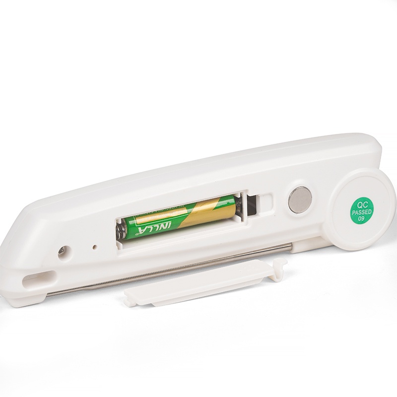 - Que đo nhiệt độ có chiều dài khoảng 20cm. Trong đó 2/3 chiều dài của thiết bị là que kim loại để thu nhận thông số nhiệt độ từ thực phẩm. Thiết kế từ kim loại sẽ giúp cho việc thu nhận nhiệt độ nhanh và chính xác hơn, hạn chế tối đa sai số.