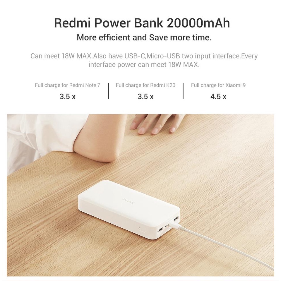Giới thiệu [ Bản Quốc Tế có Cáp ] Sạc dự phòng Xiaomi Redmi 20000mAh Sạc nhanh 18W Micro USB & Type-C - Chính hãng phân phối