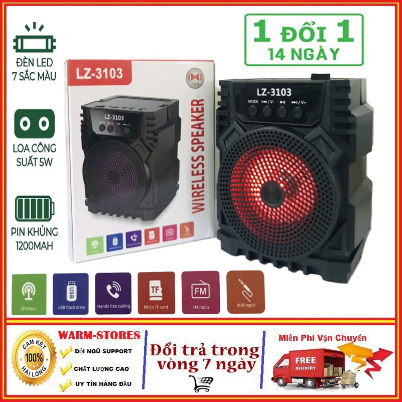 [Rẻ Vô Địch] Loa Bluetooth mini Xách Tay LZ-3103, Đen Led 7 Màu, Âm Thanh Chất Lượng Hỗ Trợ Cắm Thẻ Nhớ Và Usb- Loa Bluetooth Không dây LZ - 3103 trang bị công nghệ bluetooth vô cùng phổ biến nên bạn có thể kết nối loa với các thiết bị công nghệ thông minh như điện thoại, máy tính bảng, laptop đấy nhé. Sử dụng bluetooth ở loa cũng rất đơn giản, chỉ cần mở nguồn là loa sẽ tự động mở kết nối bluetooth, sau đó kết nối bluetooth của điện thoại bạn với loa là có thể nghe nhạc, xem phim, gọi điện trò chuyện thông qua loa cực kì thoải mái thoải mái.