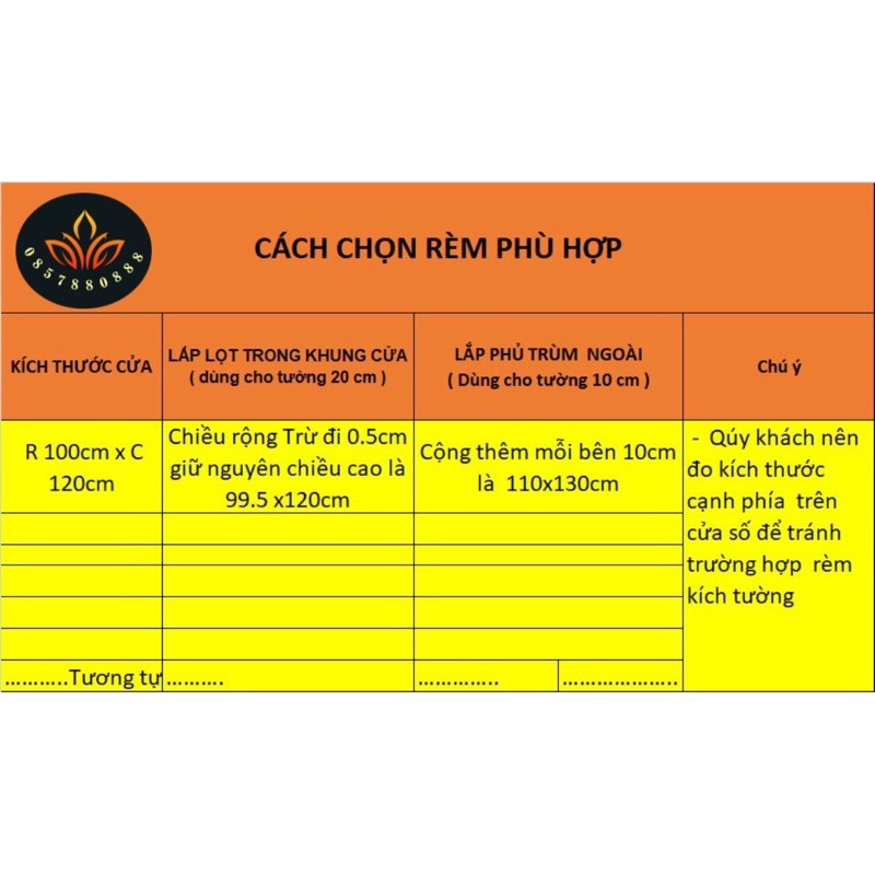 Chiều Rộng + 10cm và Chiều cao + 10cm cao chúng ta được kích thước rèm phù hợp là Rộng 110cm và cao 130cm ( rộng 1,1m cao 1,3m)