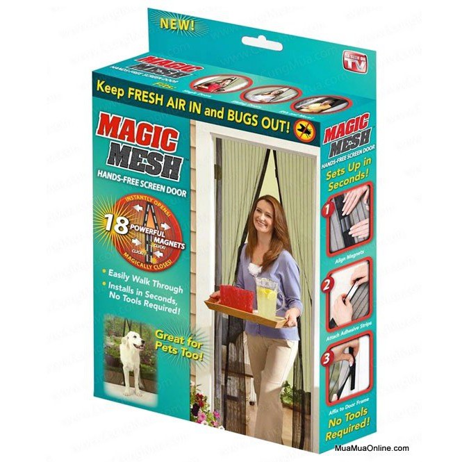 - Rèm cửa nam châm chống muỗi Magic Mesh được thiết kế có những miếng dán nam châm tiện lợi, và bền chắc. Màn thiết kế dạng lưới dai, bền, đảm bảo độ thoáng mát, gió có thể lùa qua nhưng lại có thể ngăn chặn muỗi và các côn trùng khác