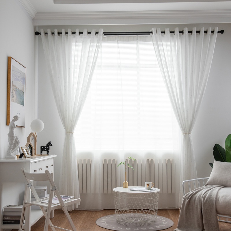 Bộ rèm cửa sổ sử dụng rèm cửa sổ trắng được thiết kế kiểu rèm cửa dán tường có thể dùng dán tường, dán cửa sổ, nhất là rèm voan đang rất được ưa chuộng. Rèm voan dán tường được sử dụng làm rèm cửa sổ dán tường, background chụp ảnh có thể tự thi công dễ dàng bằng việc sử dụng miếng dán dính tường.