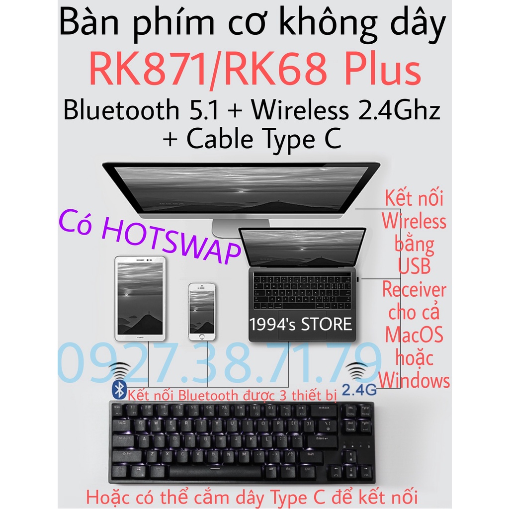 RK68 Plus/RK871 VERSION 4.0 HOTSWAP - Bàn phím cơ không dây - Bluetooth 5.1 - Wireless 2.4G - Type C - Phần mềm Macro