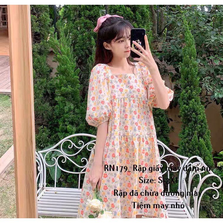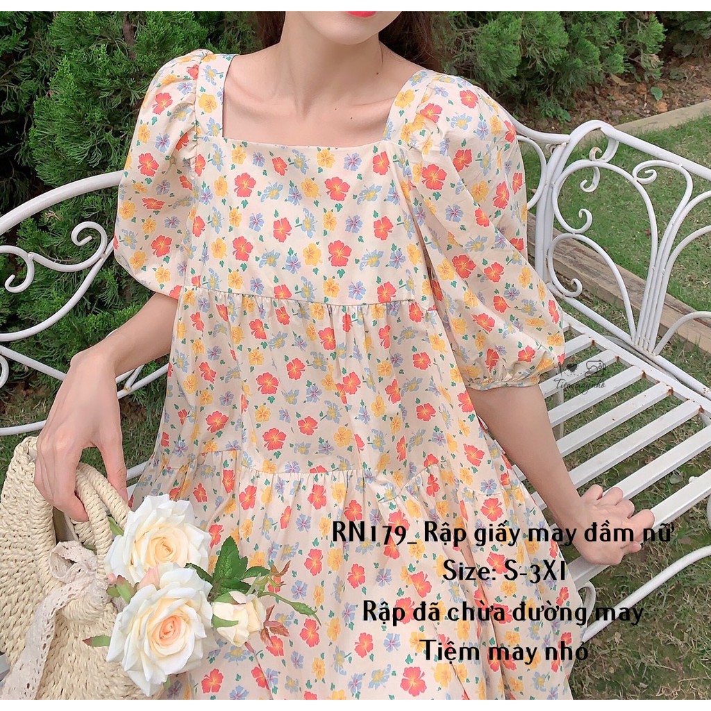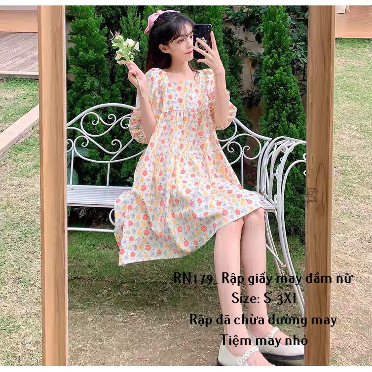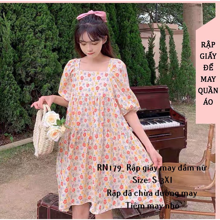 RN179_rập giấy may đầm xòe cổ vuông nữ