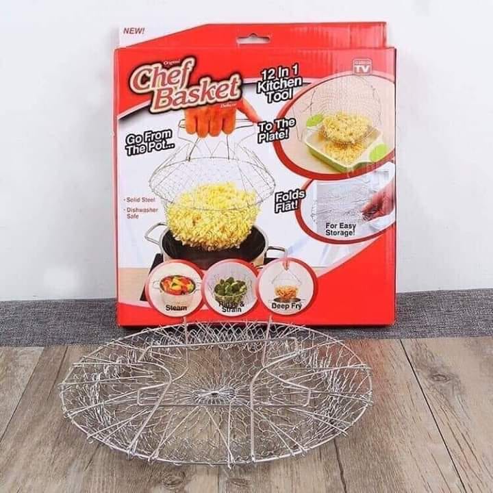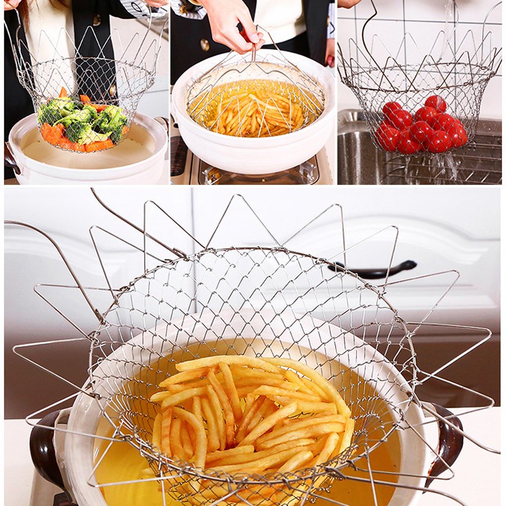 - Rổ Nhúng Thông Minh với thiết kế thông minh gồm các móc xích dễ gập gọn, nhanh chóng biến hóa thành nhiều công cụ giúp bạn luộc, chiên thức ăn đơn giản và nhanh hơn. Hay biến thành một chiếc rổ tiện lợi, giúp thực phẩm luôn khô ráo, sạch sẽ.