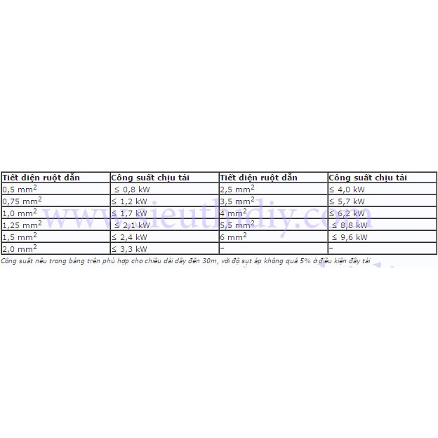 Trong phần hình minh họa có bảng công suất chịu tải của dây điện thường dùng.