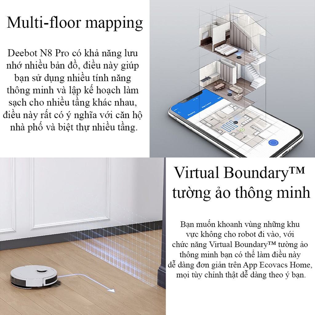 💨 Deebot N8 Pro có khả năng lưu nhớ nhiều bản đồ, điều này giúp bạn sử dụng nhiều tính năng thông minh và lập kế hoạch làm sạch cho nhiều tầng khác nhau, điều này rất có ý nghĩa với căn hộ nhà phố và biệt thự nhiều tầng.