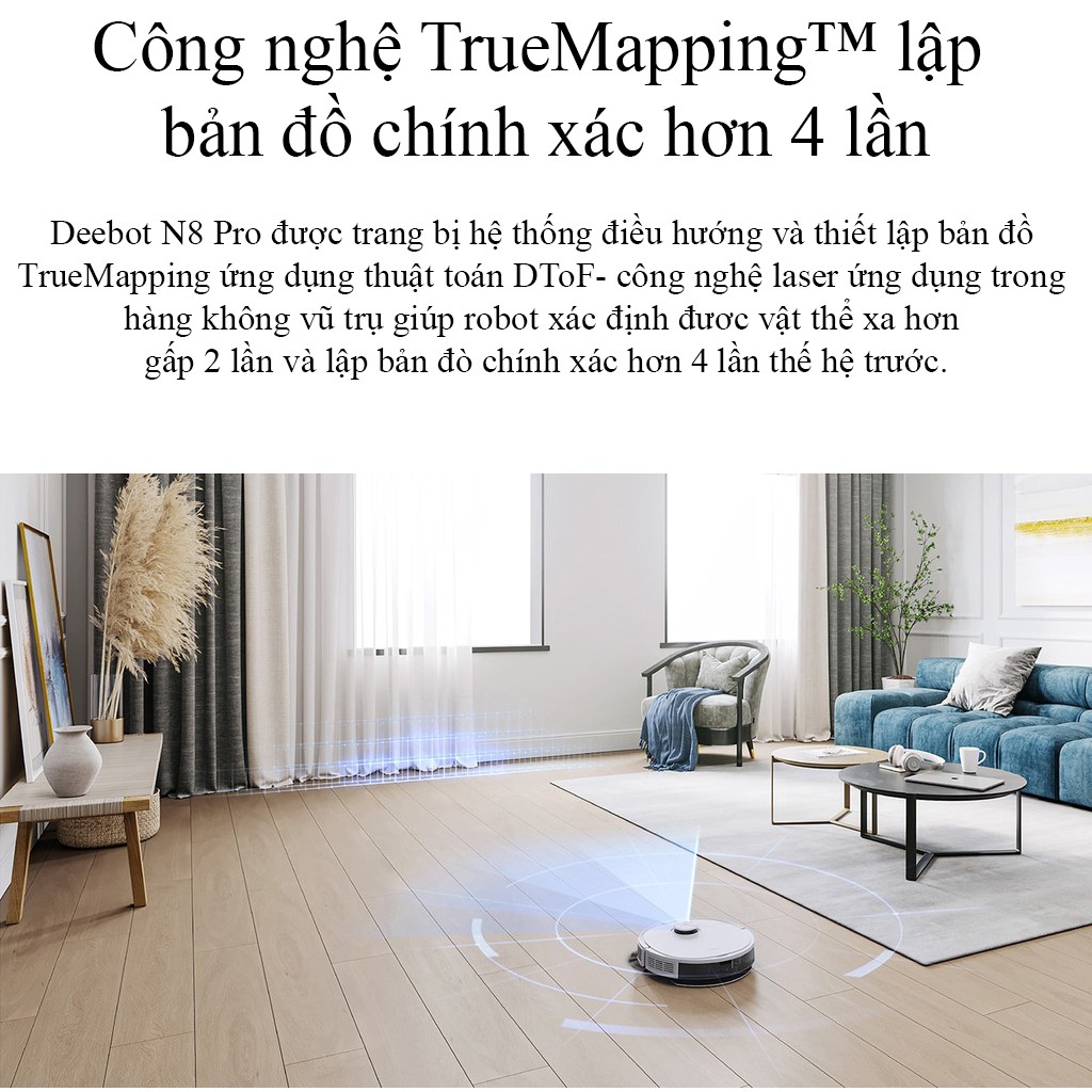 💨 Deebot N8 Pro được trang bị hệ thống điều hướng và thiết lập bản đồ TrueMapping ứng dụng thuật toán DToF- công nghệ laser ứng dụng trong hàng không vũ trụ giúp robot xác định đươc vật thể xa hơn gấp 2 lần và lập bản đò chính xác hơn 4 lần thế hệ trước.