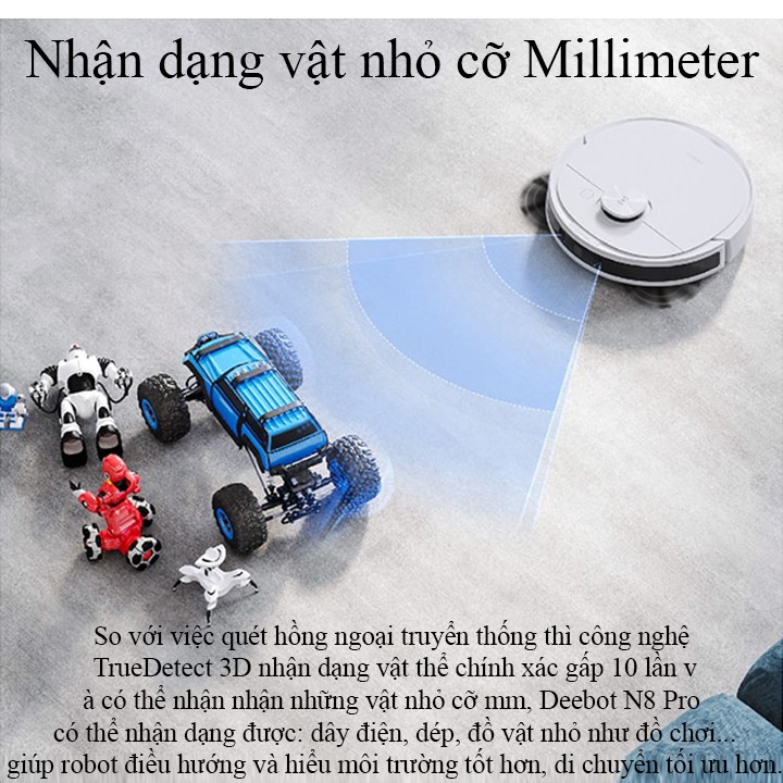 💨 So với việc quét hồng ngoại truyển thống thì công nghệ TrueDetect 3D nhận dạng vật thể chính xác gấp 10 lần và có thể nhận nhận những vật nhỏ cỡ mm, Deebot N8 Pro có thể nhận dạng được dây điện, dép, đồ vật nhỏ như đồ chơi...giúp robot điều hướng và hiểu môi trường tốt hơn, di chuyển tối ưu hơn.