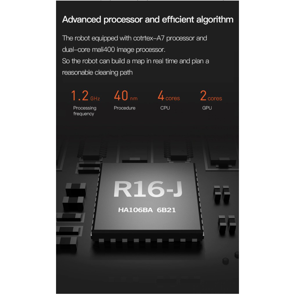 Xiaomi Vacuum Mop Pro sở hữu bộ xử lí Cortex-A7 và bộ xử lí hình ảnh MALI 400 lõi kép và sử dụng thuật toán SLAM. Nhờ đó Robot hút bụi Vacuum Mop Pro có thể xử lí thông tin một cách nhanh chóng, chính xác, lên kế hoạch làm sạch hiệu quả và phù hợp hơn.