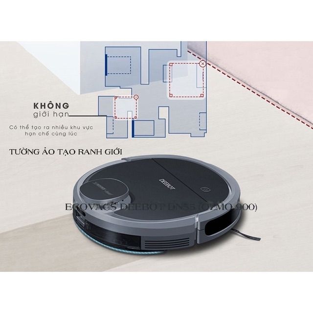 *Ecovacs Deebot DN55 tích hợp hai chức năng hút bụi và lau nhà đồng thờiEcovacs Deebot DN55 là robot tích hợp cả 2 chức năng hút bụi và lau nhà đồng thời. Giúp hiệu quả làm sạch gấp đôi mà lại tiết kiệm được thời gian và năng lượng. Cùng với các công nghệ thông minh như tạo bản đồ không gian ngôi nhà bằng việc quét laser, nhờ đó mà Robot có thể nhìn thấu toàn ngôi nhà, kết hợp với công nghệ Smart NAVI để quy hoạch đường đi làm sạch hiệu quả nhất. Ngoài ra bạn cũng có thể lựa chọn khu vực cần làm sạch dựa trên bản đồ qua ứng dụng trên điện thoại.